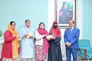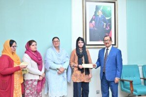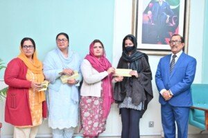 The cheque distribution was carried out by Ijaz Ahmad Nasir, Secretary ILWT, alongside Prof. Dr. Kanwal Ameen, Vice Chancellor, and Dr. Sadia Asim, Registrar of GCWUF. They personally handed over the cheques to the deserving awardees.