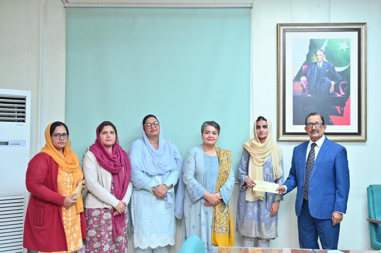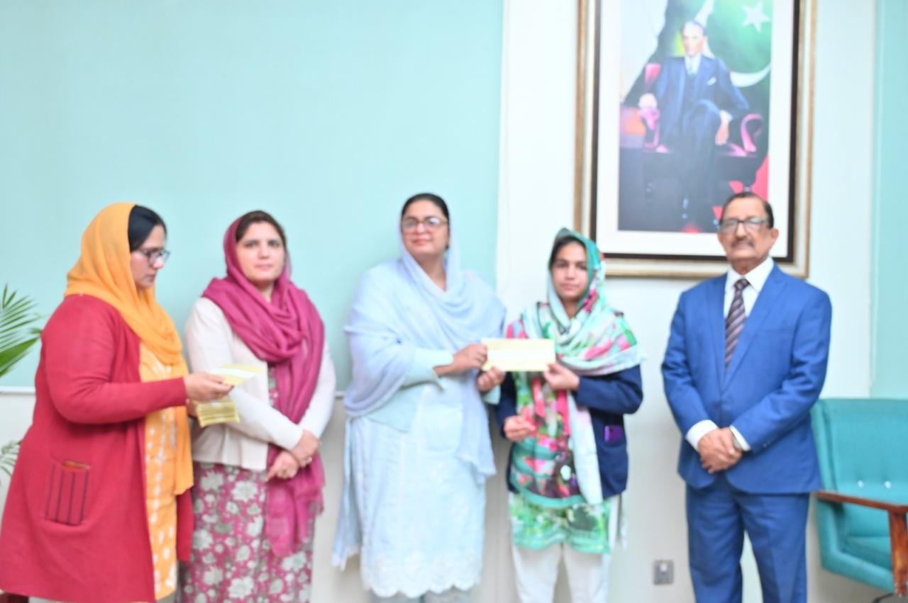 The cheque distribution was carried out by Ijaz Ahmad Nasir, Secretary ILWT, alongside Prof. Dr. Kanwal Ameen, Vice Chancellor, and Dr. Sadia Asim, Registrar of GCWUF. They personally handed over the cheques to the deserving awardees.
